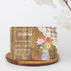 Este bonito convite para o casamento mostra uma imagem de um brilhante buquê floral em um vaso de jarro de pedras contra um pano de fundo brilhante de madeira. Uma faixa floral branca de rendas pendura contra a madeira no lado direito. Seu texto personalizado está em branco no lado esquerdo. A parte de trás do convite tem o mesmo padrão de madeira. Perfeito para um casamento rústico ou ocidental, e em qualquer estação. *Este design usa trabalho de arte floral em www.CreatetheCut.com.