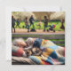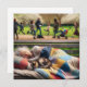 Mulher sem-teto deslocada a dormir no banco do parque à medida que o mundo a rodeia. Brincando no parque, ela provavelmente é mãe e avó também.