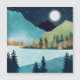 Uma bela paisagem com texturas únicas mostrando uma paisagem de lago de montanha com lua ascensão e céu estrelado em tons de azul, ouro, verde e turquesa.