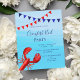 Um convite elegante para uma costa náutica pela festa de verão do mar, festa de praia ou mariscos. Água do mar azul como fundo e uma grande lagosta vermelha e bandeiras pretas e vermelhas como decoração. Modelos para detalhes de sua parte, informações. 1 folha = 1 convite impresso de borda a borda.