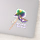 Vinheta-adesivo de corte personalizado com uma imagem de uma bela máscara de cetim roxa, verde e dourada sobre um pau com penas e fitas de coordenação de cores, e a frase "Laissez Les Bon Temps Rouler!" (Deixe o Bom Tempo Roll) em roxo francês. Veja o adesivo redondo correspondente, a bolsa de favor e a etiqueta de favor. Veja toda a coleção do Mardi Gras Sticker nos CONVITES | Seção Stickers & Labels
