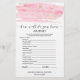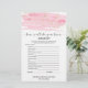 Este jogo "o que está na sua bolsa", embebido em água e ouro, é perfeito para um chá de panela moderno romântico e doce. A frente do cartão de jogo apresenta "como você conhece bem a noiva", e a parte de trás do cartão contém "o que há na bolsa". A luxuosa design feminina apresenta uma textura de cor d'água de rosa claro com um salto de poeira falsa dourada e uma elegante letra do roteiro de caligrafia. Nota: Este design não apresenta brilho de ouro real. É um gráfico de alta qualidade feito para parecer um brilho dourado. Personalize a parte frontal da placa com o nome da noiva e a data do chá de panela. Desenhado com o Care por Miriam na Fresca e Iummy Paperie. Para coordenar itens, visite minha loja Zazzle: