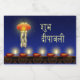 Parabéns Diwali: uma lâmpada brilhante Diwali com diyas vermelhas (lâmpadas de óleo índio em forma de xícara) com uma borda ornamental sobre fundo noturno do céu e a saudação escrita em Sanskrit.