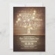 O encantador convite de casamento russo com a velha árvore esculpida e com a corda de luzes pendurada. Coleção romântica de convite para casamento de madeira.