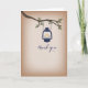 Um cartão de agradecimento com uma ilustração de uma lanterna azul de camping pendurada em um galho de árvore com folhas verdes. O texto na frente diz "Obrigado". O fundo é inspirado em cartão. O interior é em branco. Este cartão também pode ser comprado em tamanho de cartão de nota menor. Procure por convites de casamento e mais em Jill's Paperie.