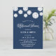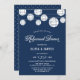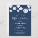 Um convite de janto de ensaio brilhante e moderno, com lanternas de papel suspensos brancas e roteiro elegante sobre fundo azul marinho. Este convite será perfeito para jantadas de ensaio ao ar livre e náutico.