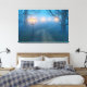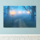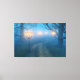 Quatro luzes brilhantes em quatro postes brilham através de uma neblina densa, iluminando um caminho de enrolamento através das sombras e faixas nuas de árvores de inverno.