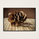 Este cartão comercial de artista apresenta uma composição muito simples, ainda viva, de um cone de laranja-marrom-ouro solteiro ainda acoplado ao seu galho sobre uma palha contra fundo marrom-chocolate. O detalhe requintado desse pequeno cone se parece com um rosa de madeira. Adorável para o Natal e o feriado.