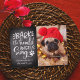 O cartão com fotos de feriado para cães apresenta uma imagem favorita de seu amigo de quatro pernas alinhada à direita, com "Latido! Os anjos arald cantam" em letras brancas tipográficas escritas à mão sobre um fundo calkboard rústico. Personalize com sua saudação e nomes personalizados abaixo (mostrados com "pawlidays felizes") e adicione uma foto adicional ao verso.