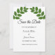 O elogio verde legante sai em branco Guarde o Cartão de Convite para Casamento de Data. O verso tem três folhas da baía sobre fundo verde-liberal.