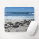 Uma cena cativante de ondas de espuma do mar oceano sobre uma praia arenosa cheia de rochas de lava em um dia tropical azul brilhante. Perfeito para qualquer decoração ou acessório de tema de praia.