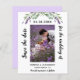 Um casamento moderno Salve o cartão com fotos de Data. Decorado com flores de lavanda, flores e verde de eucalipto. Personalize e adicione sua foto, data, nomes. 1 folha = 1 convite impresso de borda a borda.