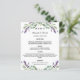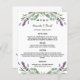 Um cartão de cardápio de casamento elegante e glamouroso. Personalize e adicione seus nomes, data e menu de casamento. Decorado com flores de lavanda, flores e verde de eucalipto.