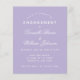 Um simples convite festa de noivado com uma cor moderna: lavanda (roxo claro). Tem apenas texto branco sobre fundo de lavanda. Os nomes são escritos num script caligráfico elegante, o resto em bonés. a primeira linha é texto arquivado.