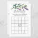 Jogo Bingo chá de panela - Este design apresenta uma ilustração aquarela de flores de lavanda roxas e folhagem de eucalipto. No topo - confete de efeito esverdeado.