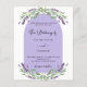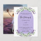 Um fundo branco decorado com flores lavandas, verde de eucalipto e armação de arco. Personalize e seus nomes e detalhes. Voltar: Personalize e adicione sua foto. 1 folha = 1 convite impresso de borda a borda.