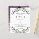 Um fundo branco decorado com flores lavandas e verde de eucalipto. Personalize e seus nomes e detalhes. Voltar: adicione o URL do site de fotos e casamento ao código QR para obter detalhes e/ou RSVP. Com uma camada branca de fotos para que você possa ler o texto. 1 folha = 1 convite impresso de borda a borda.