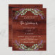 Madeira marrom russa como fundo decorado com flores de lavanda e verde de eucalipto. Personalize e seus nomes e detalhes. 1 folha = 1 convite impresso de borda a borda.
