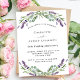 Um fundo branco decorado com flores lavandas e verde de eucalipto. Personalize e seus nomes e detalhes. 1 folha = 1 convite impresso de borda a borda.