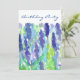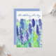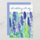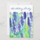 Um bonito convite de aniversário floral com um jardim de flores lavandas pintado com aquarelas acentuadas com tons azuis e verdes brilhantes.