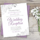 Estes convites para recepções de casamento baratos, amigáveis ao orçamento são a escolha perfeita para classe, estilo e beleza em um orçamento. Projetados para convidados para a recepção, mas não para a cerimônia, eles apresentam um fundo branco clássico com ornamentados de forro de prata nos cantos. A tipografia inclui rico lavanda roxa com letra para um estilo simples e elegante. Uma maneira maravilhosa de convidar seus amigos e família para compartilhar sua alegria em seu dia especial sem quebrar o banco.