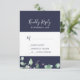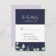 Este simples cartão RSVP azul azul-marinho rústico é perfeito para um casamento simples e elegante ao ar livre. O design floral apresenta folhas de cor aquosa de eucalipto e de verde com ranhuras de flores silvestres roxas sobre fundo azul escuro.
