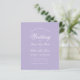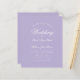 Um simples convite para casamento de orçamento minimalista. Tem apenas texto branco sobre fundo de lavanda (roxo). A palavra Casamento e os nomes são escritos em um roteiro caligráfico elegante.