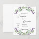 Um fundo branco decorado com flores lavandas e verde de eucalipto. Personalize e seus nomes e detalhes. 1 folha = 1 convite impresso de borda a borda.