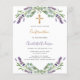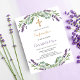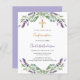 Um fundo branco decorado com flores lavandas e verde de eucalipto. Personalize e um nome e detalhes. Fundo: lavanda, fundo colorido violeta. 1 folha = 1 convite impresso de borda a borda.