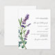 Um fundo branco decorado com uma flor de lavanda grande e um rolo verde de eucalipto. Personalize e seus nomes e detalhes. 1 folha = 1 convite impresso de borda a borda.