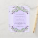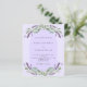 Um fundo violeta decorado com flores lavandas roxas, verde eucalipto e armação de arco. Personalize e seus nomes e detalhes. Voltar: adicione o URL/link ao seu site de casamento para obter mais detalhes e/ou RSVP. 1 folha = 1 convite impresso de ponta a ponta.