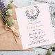 Fundo rosa. Uma coroa floral feita de flores lavandas, verde de eucalipto de cor aquosa e cruz de ouro. Personalize e adicione um nome e detalhes. 1 folha = 1 convite impresso de borda a borda.