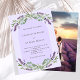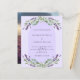 Um fundo violeta decorado com flores lavandas roxas, verde eucalipto e armação de arco. Personalize e seus nomes e detalhes. Voltar: Personalize e adicione sua foto. 1 folha = 1 convite impresso de borda a borda.