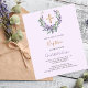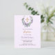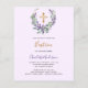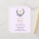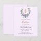 Fundo violeta. Uma coroa floral feita de flores lavandas, verde de eucalipto de cor aquosa e cruz de ouro. Personalize e adicione um nome e detalhes. 1 folha = 1 convite impresso de borda a borda.