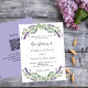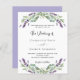 Um fundo branco decorado com flores lavandas e verde de eucalipto. Personalize e seus nomes e detalhes. Voltar: adicione o URL do site de casamento ao código QR para obter detalhes e/ou RSVP. 1 folha = 1 convite impresso de borda a borda.