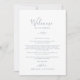 Estas cartas de boas vindas azuis e empoeiradas folhas são perfeitas para um casamento elegante. A design apresenta uma simples silhueta verde em azul-ardósia com estilo clássico minimalista. A frente da carta apresenta uma carta de boas-vindas e a parte de trás da carta apresenta o itinerário do casamento. Estas notas são perfeitas para casamentos de destino e bolsas de boas-vindas de hóspedes.