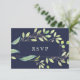Este cartão de resposta ao casamento de moda e na moda apresenta um quadro verde claro de aquarela e uma tipografia moderna num fundo azul-da-noite.