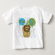 Um leão bonito com uma expressão parva em sua cara veste um chapéu do partido e é cercado por confetes e por balões do aniversário. T-shirt, bodysuits, canecas, cartões, e mais do design do leão do aniversário do bebê primeiros.
