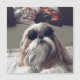 Personalize e personalize a ideia de presente dos amantes de cães divertidos. Engraçado fofinho, cadela branca e marrom, com nariz preto grande, cabelo comprido e óculos coloridos de sol da velha escola. Legal Shih Tzu deitado e resfriado no sofá e se posando como um profissional para um retrato.