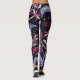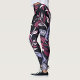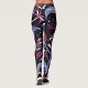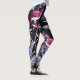 Um par de pernas vestindo pernas pretas com padrão de pássaros cor-de-rosa e folhas tropicais, a pessoa veste tênis preto e branco, o fundo é branco-claro.