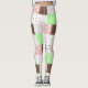 Leggings brancas de vassouras brancas, com bolinhas e estrias verdes, cor-de-rosa, mauve, castanho, burgundy e sábio. As cores quentes da Terra.