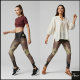 As pernas das mulheres que se apanham nos olhos têm um padrão vermelho, amarelo e preto ousado, ideal para entusiastas da malhação e amantes da moda.