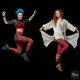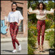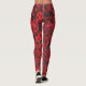 Uma mulher com leggings de abstrato vermelho e preto, mostrando o design de interferência cúbica moderna para um olhar chic.