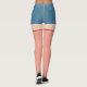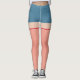 Calções azuis de denim com pernas de pele pálidas com manchas de rede de pesca brancas e vermelhas