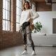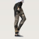 Belo design de leggings festivas, com estrelas de ouro estilizadas, cordas e bicos sobre fundo preto.