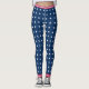 Você terá orgulho de vestir as cores dos EUA em suas leggings com este design personalizado em branco, vermelho e azul. A faixa de cintura e o fundo têm listras vermelhas e brancas, enquanto as pernas são cobertas com um padrão de estrelas brancas sobre fundo azul. Perfeito para todos os feriados patrióticos e muito mais.