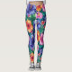 Uma estampa floral tropical ousada e maximalista com grandes flores roxas, laranja e rosa em um fundo azul escuro cobre estas leggings vibrantes.