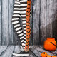 Enfie suas coisas neste Halloween neste par de pernas com listras pretas e brancas e uma longa faixa laranja correndo pelo lado da sua perna com muitos morcegos.