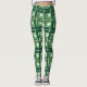 Essas pernas têm um design geométrico feito de Ls em tons de verde dispostos em diferentes direções se repetindo na design.