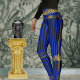Um preto e azul de luxo com um par de pernas de ouro com uma faixa preta e azul com correntes douradas sobre as pernas e a cintura.